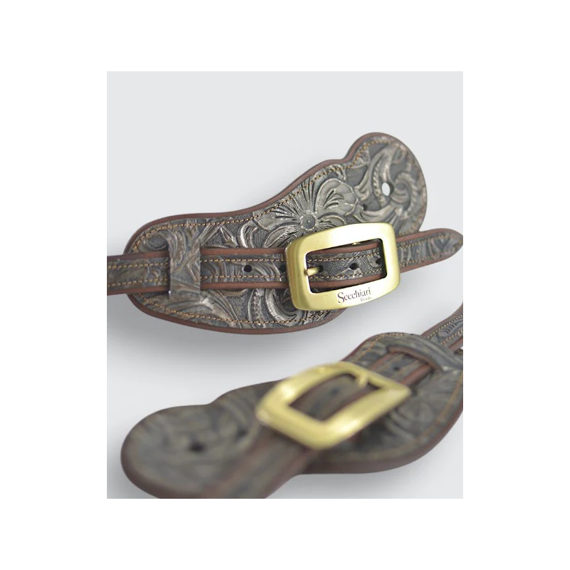 Remienky na ostrohy vyrobené  v Taliansku z certifikovaných talianskych koží. Oceľová pracka bez obsahu niklu. Možnosť vybrať si striebornú alebo bronzovú farbu spony.